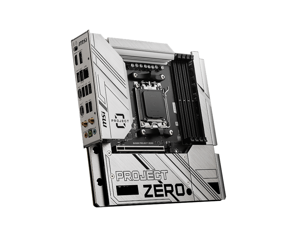 B650M PROJECT ZERO MOVES THE POWER CONNECTORS, FAN CONNECTORS, AND OTHER PIN HEADERS TO THE BACK OF THE MOTHERBOARD. THIS PROVIDES A CLEANER AND NEATER FRONT VIEW, ALLOWING THE MOTHERBOARD, LIQUID COOLER, AND GRAPHICS CARD'S AESTHETIC DESIGN TO BE FULLY DISPLAYED.